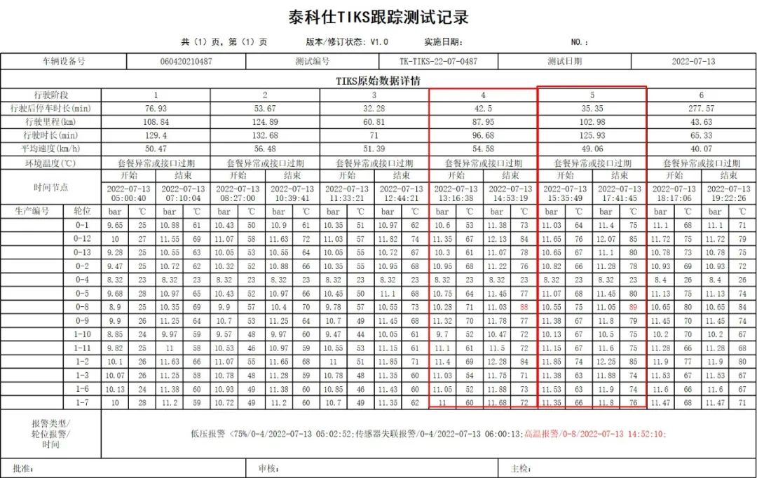 另一段高温报警纪录显示,7月13 日,起重机在第4、5次阶段行车时,轮位胎温也曾超过88℃——达到泰科仕高温报警阀值,高温警报发出后,司机也立刻进行了停车休息。
